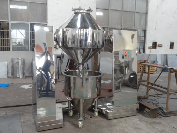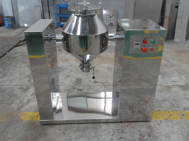 W型雙錐混合機由雙錐筒、機械密封、機架、減速傳動、攪拌葉片等構(gòu)成。該機的工作過程是:把需混合的幾種物料通過真空輸送或人工加料投放到雙錐體內(nèi),上好筒蓋,開起設(shè)備,雙錐筒及攪拌葉片同時轉(zhuǎn)動,旋轉(zhuǎn)的雙錐筒使筒體內(nèi)物料產(chǎn)生紊亂翻滾混合,高速旋轉(zhuǎn)的攪拌葉片打碎結(jié)團物料,使物料在筒體內(nèi)快速混合。W型雙錐混料機工作過程無死角,無沉積,可使混合的物料快速達到均勻一致的效果。